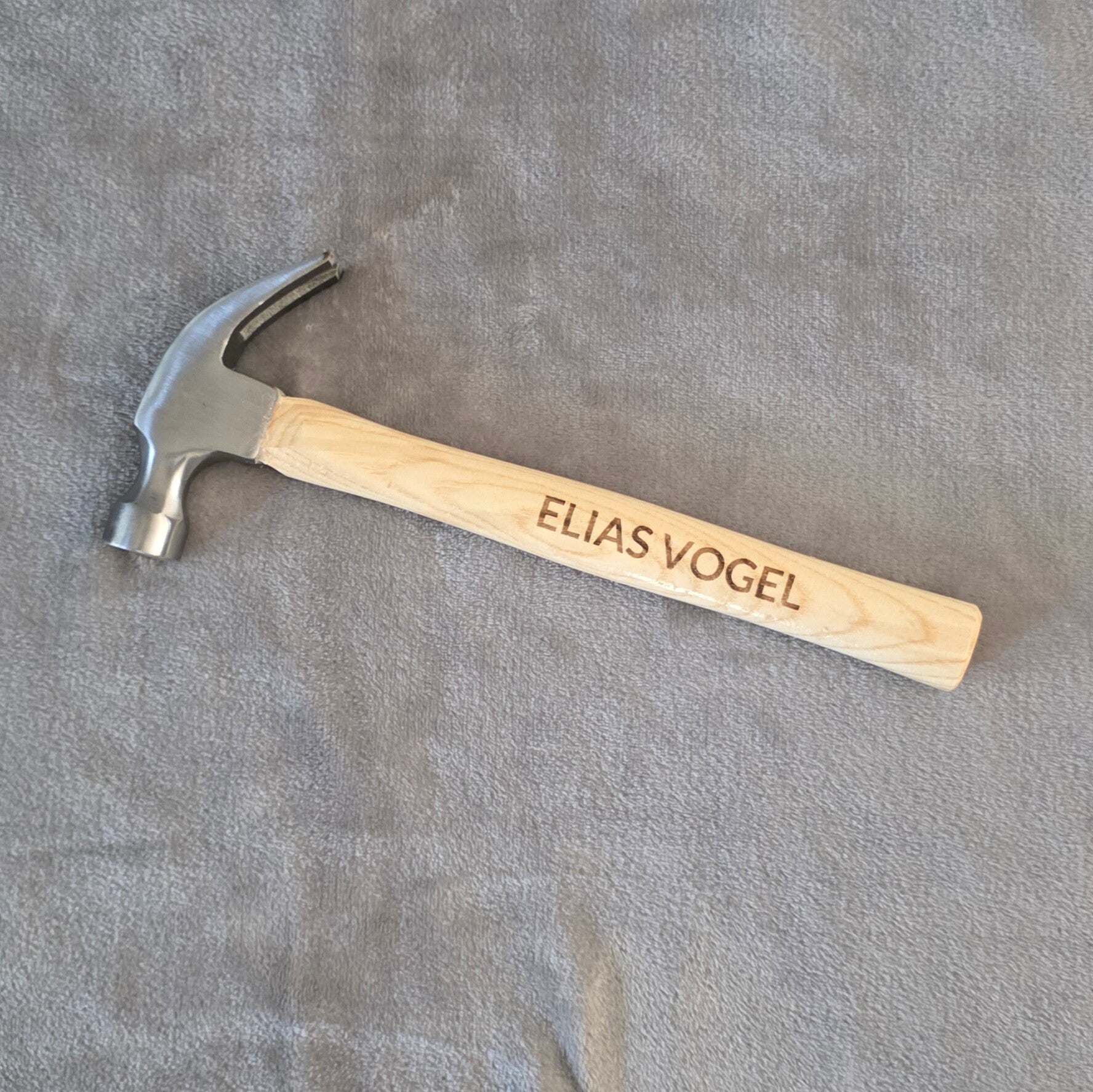 Mooie klauwhamer met houten handvat. Daarop kan een naam of korte tekst worden gegraveerd.
