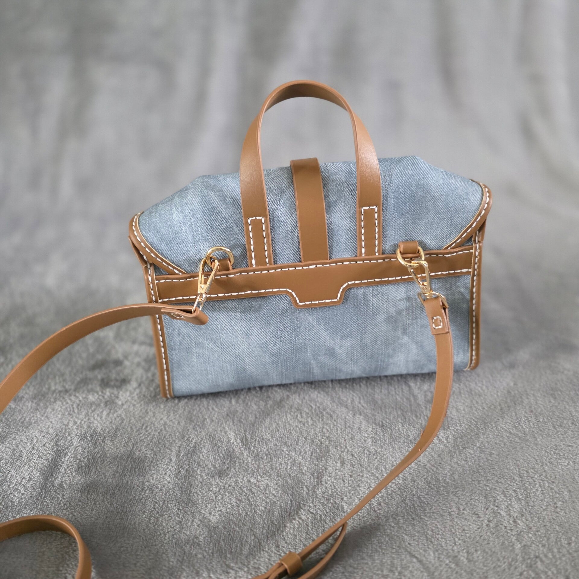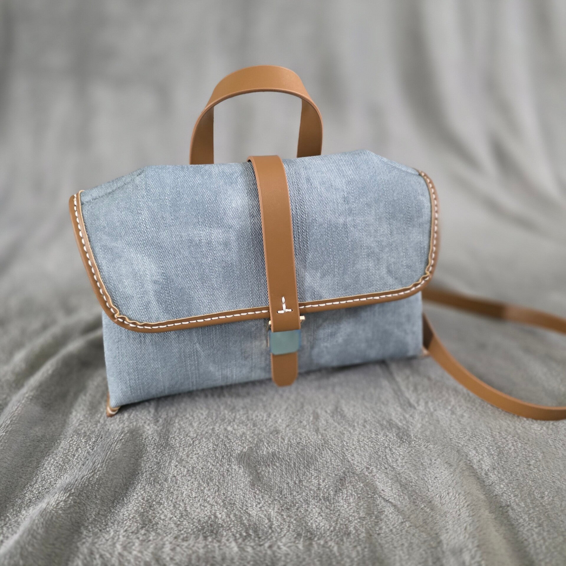 Deze handgemaakte HOHA-tas #HH025 is een mooie schoudertas / handtas in de gecombineerde kleuren jeansblauw en camel.