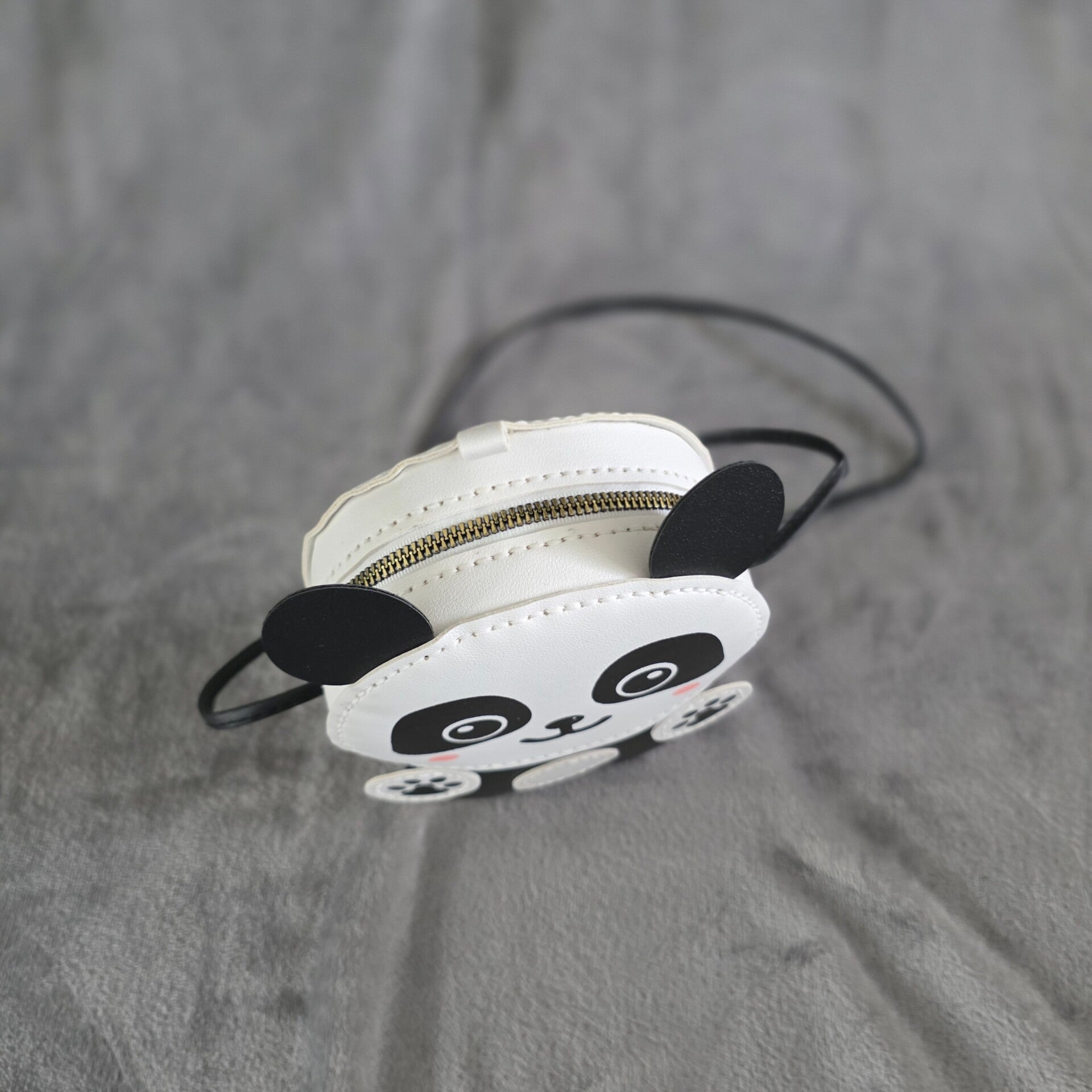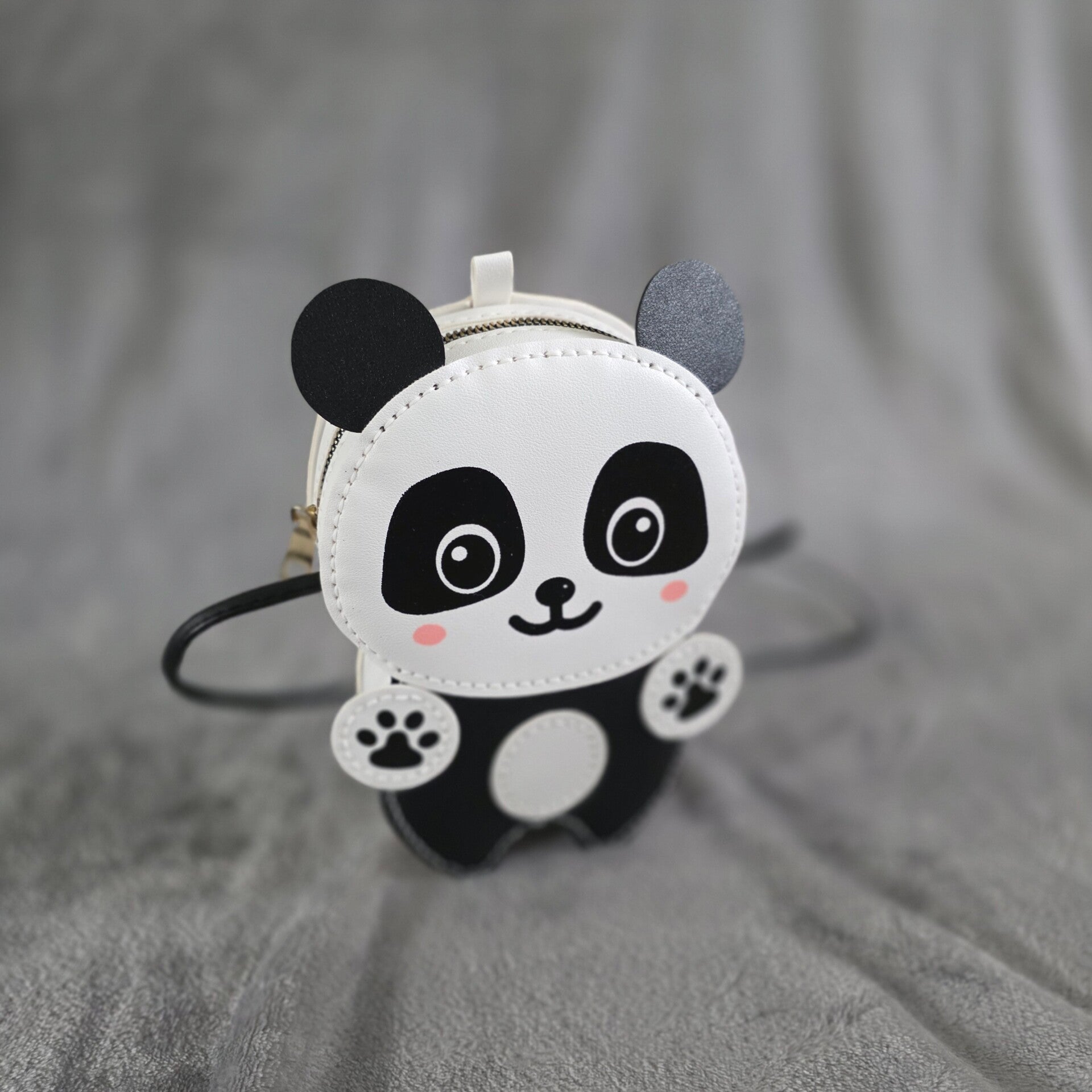 Deze handgemaakte HOHA-tas #HH027 is een vrolijke schoudertas in de gecombineerde kleuren wit, zwart en een klein beetje roze: de panda!