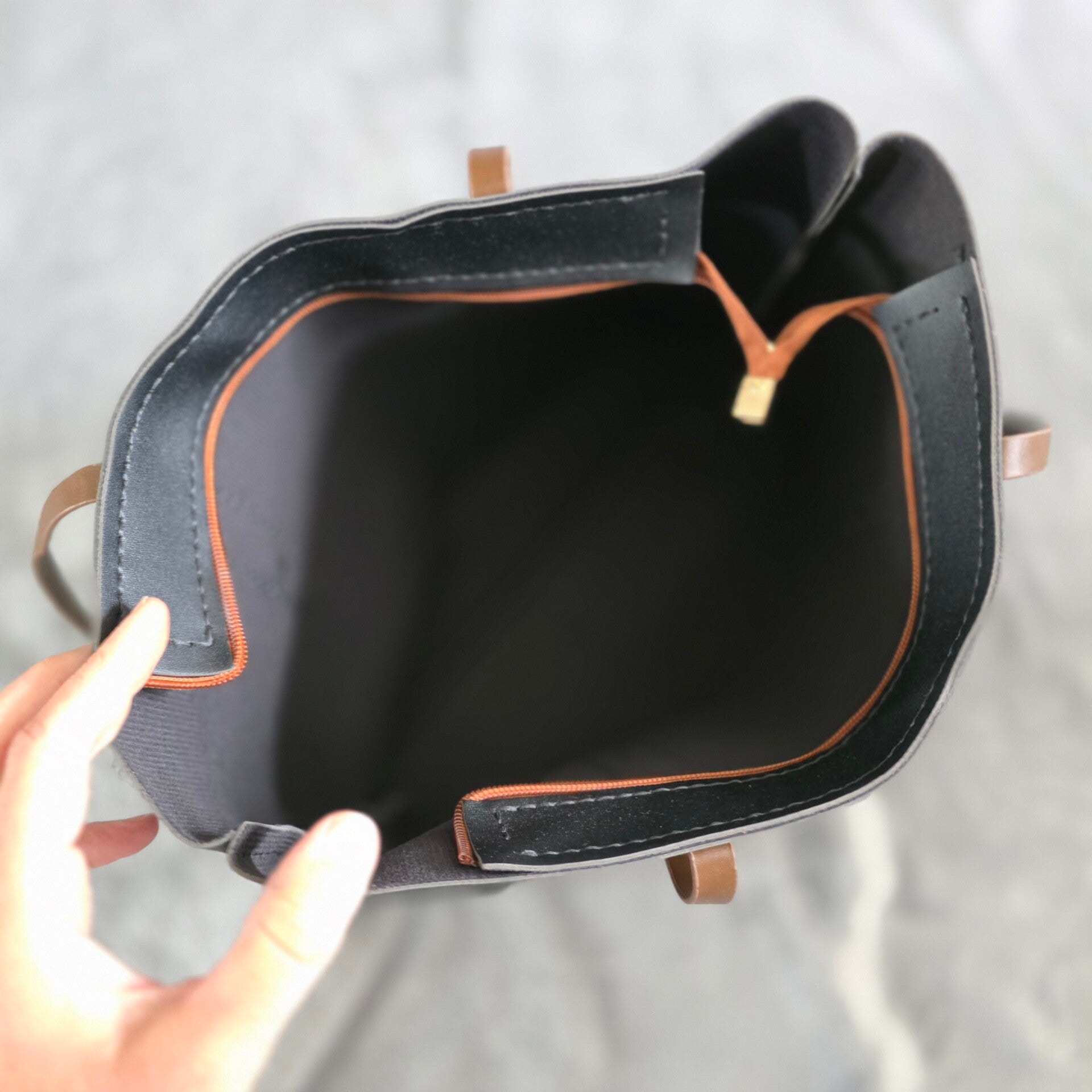 De tas is voorzien van een bruine ritssluiting en goudkleurige details.